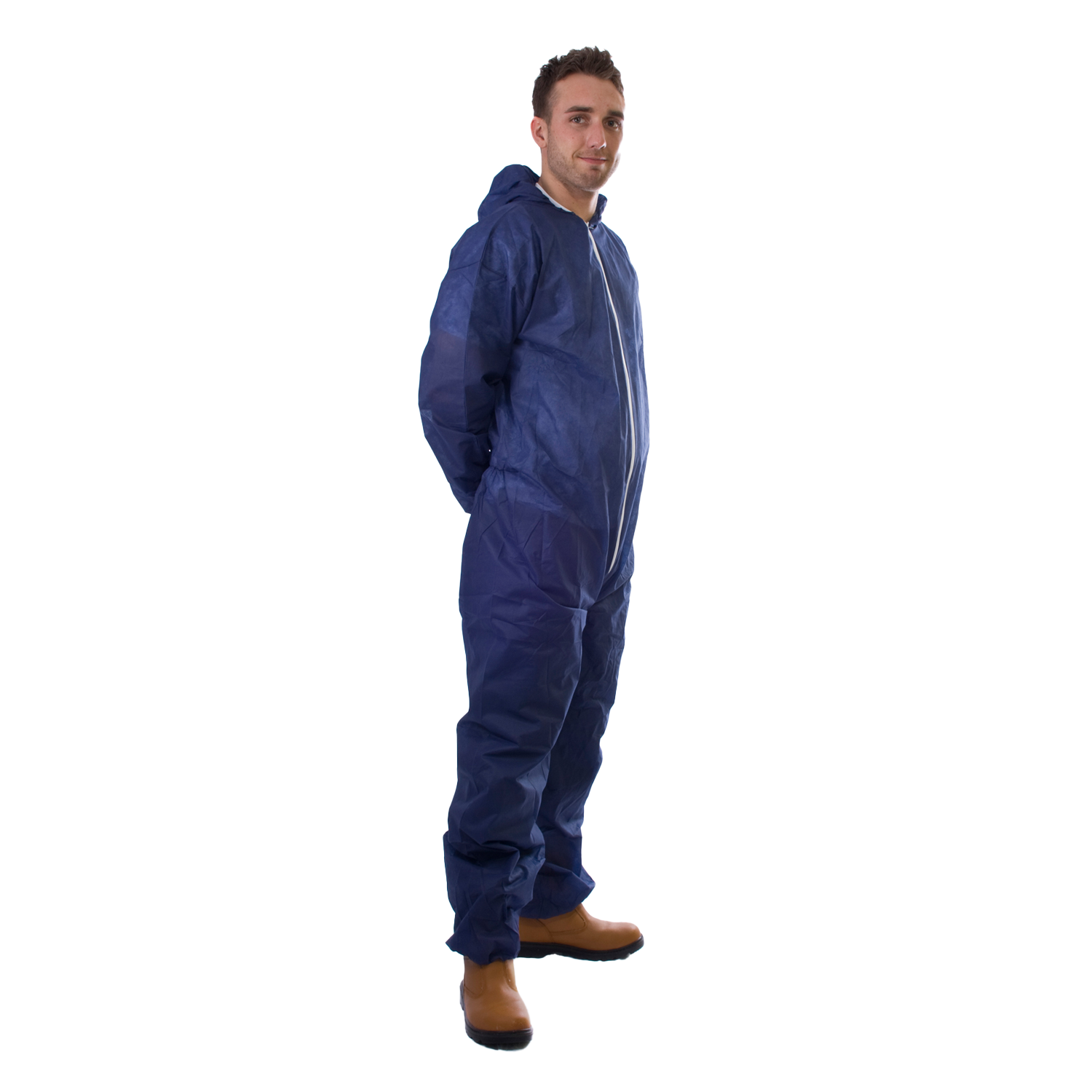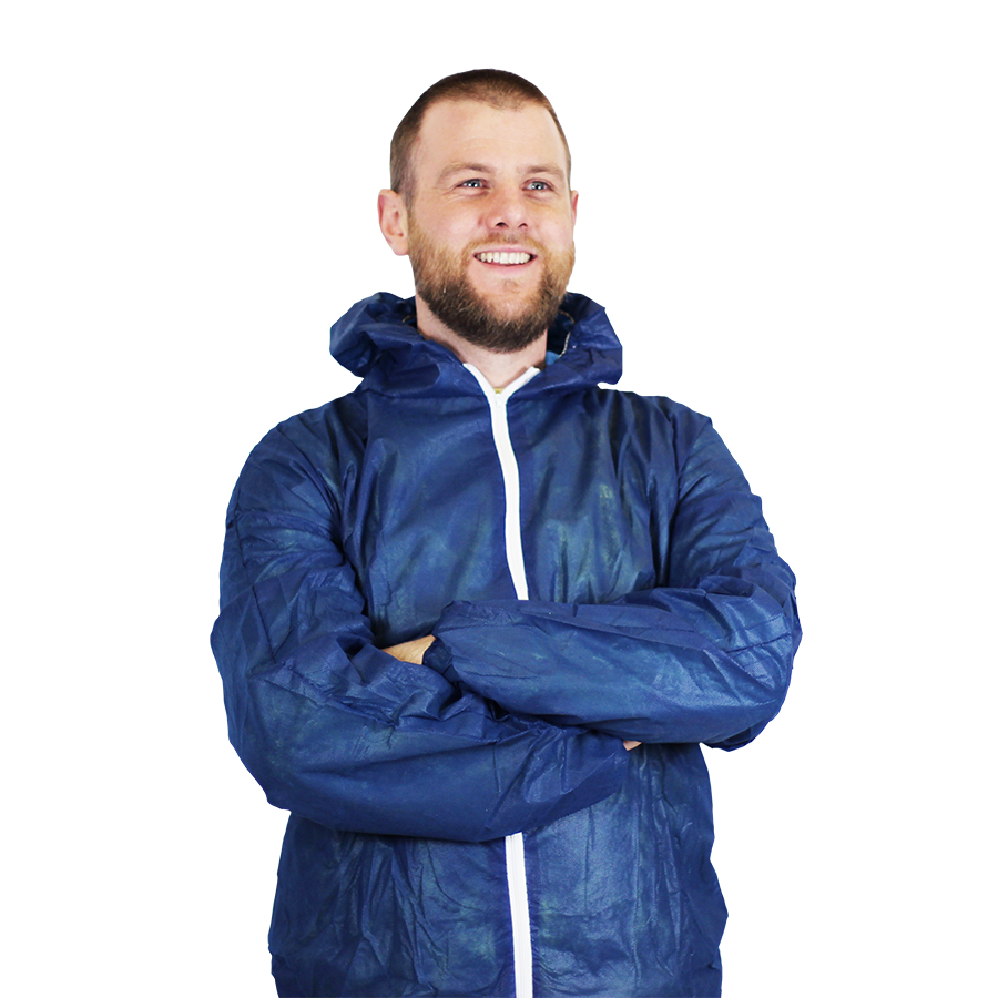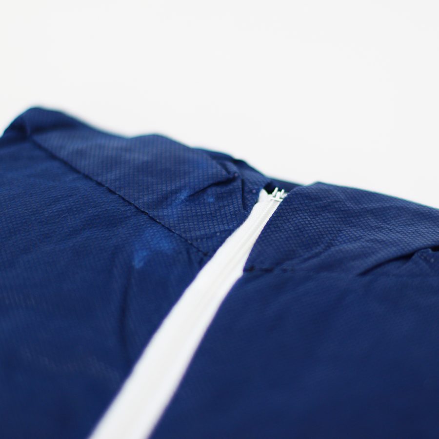 PP non-woven disposable zip-up blue overall. Complete with elasticated hood, cuffs and ankles.