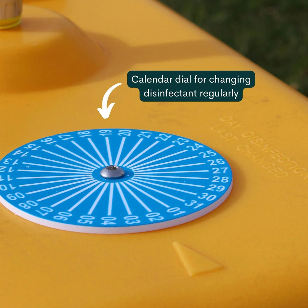 The large 20L capacity ensures full boot coverage, while the secure lid prevents contamination and dilution from rainwater. A built-in calendar dial allows easy tracking of disinfectant changes for audit compliance.