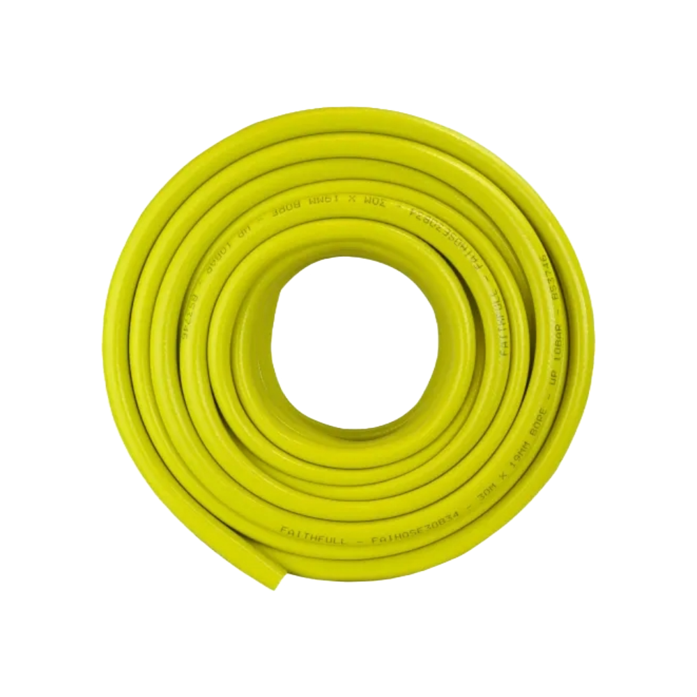 The hose is compatible with all 12.5 to 15mm or 19mm fittings depending on the bore size selected. The hose has a working pressure of 10 bar with a temperature range of -15 to +60°C. The bright yellow colour make this hose easy to spot on the farm.