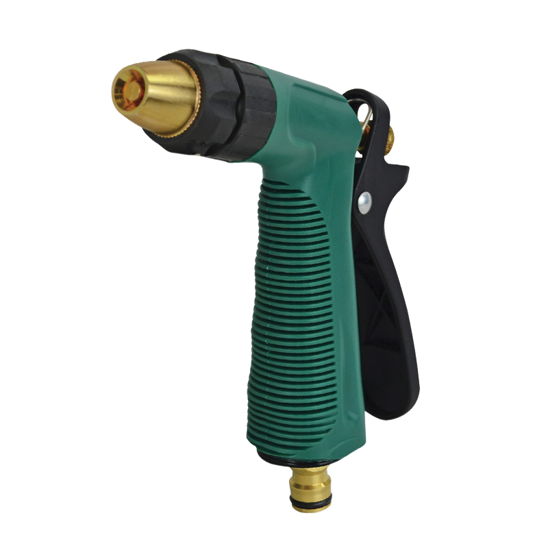 Hand spray gun has a brass nozzle, zinc alloy body and solid brass hose connector. The spray gun also has a comfort grip handle and adjusts from mist to a powerful stream.