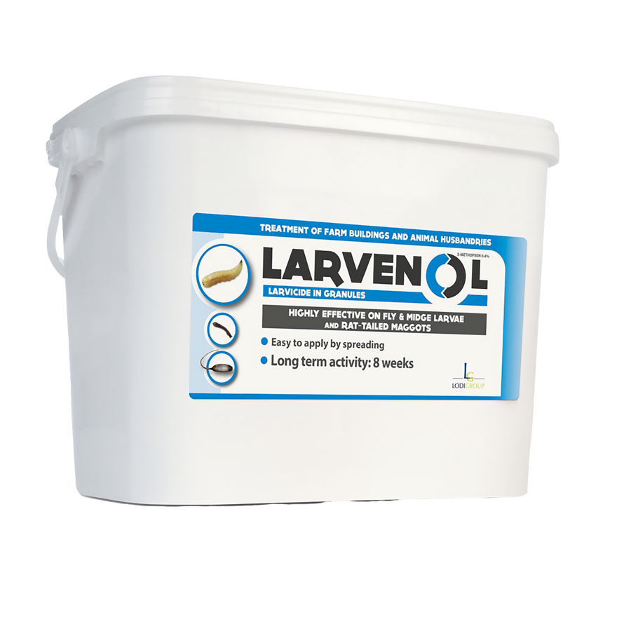 Larvenol is an insect growth regulator for use in poultry and livestock housing containing S-Methoprene. The product is applied as a granule directly onto the muck or areas where flies and maggots are breeding. Larvenol will ensure that the larvae can’t develop into adult flies and will control an infestation before it starts targetting 80% of their lifecycle.